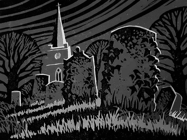 The first, ‘The Night Hunter’, I wrote during Covid but is the most recent we’ve worked on. It started out as a guitar exercise but ended up as a song about a night encounter in a church crypt. Coincidentally, I have recently started trying out lino printing again after many years and, looking for a subject to practise on, I thought I would attempt illustrating scenes from the song. There’s an example alongside. I find the process of carving lino very relaxing.